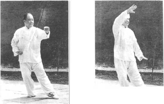 口诀:撤右腿,右拳挎起,摆正左脚,两臂上下展开。 150