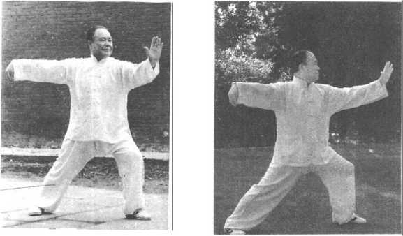 3在前面讲过,单鞭虽属弓步,但上身须正直,不宜向前倾斜, 又由于勾手动作的需要,上身应略向右转体,这样,两臂就可以兼 顾了。其上身要区别于两臂向同一方向做出弓步时的略向前或者 是正前方;而单鞭呢?由于右吊手的方向与在正前方的左臂,两者 距离角度较大,如果上身向正前方或者略偏右侧,这都不能适应右 臂吊手需要。唯有将转体的角度加大,这样两臂才可以兼顾,运用 也比较自如。因之,学者要根据不同拳势的要求及特点,尽量搞清 楚,以免误解。