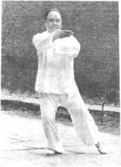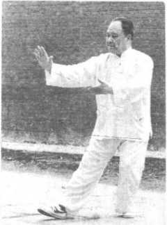 ].该势也属虚实步,但前脚是以前脚掌着地,这与提手上势之 脚跟着地又有所分别。右臂有上堋护面之意,而左臂亦有下沉护腹 之意,两臂形成了上下对拉的形势使身肢有拔长之感。