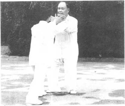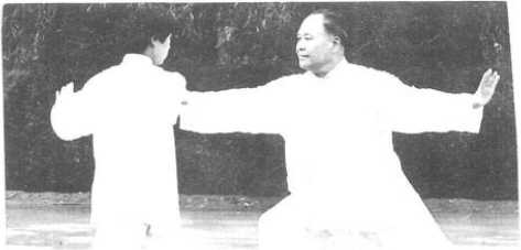 设对方向我 右侧击来,我急 以大开展之势, 使两臂向左右两 侧分开,又从下 方相合。身随腰 腿转动,先向右 侧,后向左合,两 臂之一开一合, 均以棚劲棚在对 方两手腕内侧,分其力,使其不得进。如我两臂均向外翻转,两手正好搭在对方 两小臂之上,此时,彼已失去自制,或按或击均可由我主宰(图26、 27)。