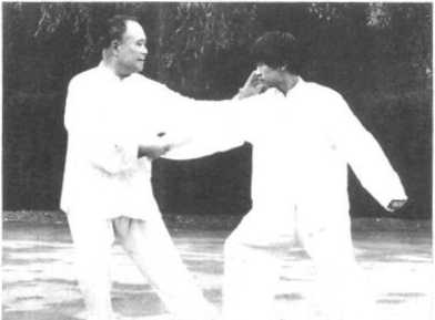 设我之左手腕为 对方紧握,同时对方 又以左手托住我之右 肘底,我已受其制,在 原地很难施展动作,此时,需退步引对方 深入,我以沉劲松其 腰胯,翻左掌向上向 左后撤臂退步,与此 同时,在对方跟进的 一刹那之间,我速翻 右掌向对方左胸部按 186 击,在此一退一进 之际,如进军之突 然受阻,使其措手 不及,必为我痛击。 此势能从败中取 胜,妙在以退为进 之用法。图37图37左右倒撵猴之 用意相同,身法步 法亦同(图36、 37) 0图37图37