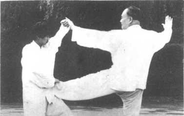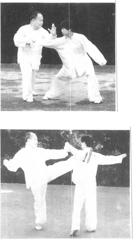 图51 图51 图52 图52 设对方在我左背一侧或右背一侧,以右拳或以左拳击来,我 即由右向左转体,将身转向正前,左腿提起(脚尖向下),右腿站稳, 图53图53急以左手接住对方 左腕,用左脚跟向 对方复部蹬去(脚 尖朝上两臂在转 体时,先由外向内 合当左脚蹬出时, 两掌同时向左右 分。两臂相合棚劲 内含,开时当视对 方之势,相应地用 采、托、按、例等手 法均可(图53)。 图53 图53