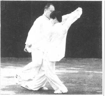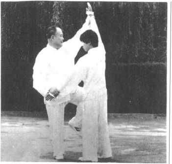设在下势过程 中,对方中途回撤,在 此形势下,我顺势将 身向前.紧跟对方一 起向上站。我之左手 先将对方之右腕提 起.右手也向前往下 紧跟(图64)。图64图64当我右手也接触 到对方左手腕时,即 以右手握其左手腕向 下沉.同时用膝直顶图64图64对方腹部或以脚踢其下身,彼必为我制 (图 65、66)。金鸡独立分左右 两式,但其用法一样。白蛇吐信该用法与转身撇身捶一样,唯撇身捶以拳,而白蛇吐信是用 掌。可参照转身撇身捶之动作要领应用(参照图42)。