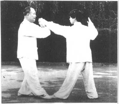 设对方用左 手自上劈下,我 速起身向左前 进,两手变拳,交 叉作十字形,售 心侧向下棚住 对方左肘,同时 亦可以双捶直接 击对方胸部(图 69)0