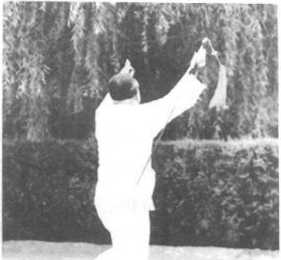 上走右上弧,两者一后一前环一 整圈。如果不注意转身用腰带,必 然呈现相互失调。因此,强调转身 以腰带背,背带臂,剑随臂动的要