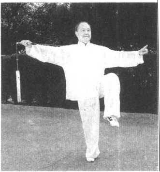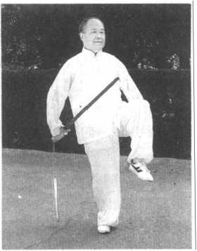 动作1:左脚微离地面,由右向左往后转体,右腿直立,左腿 屈膝提起.脚尖自然下垂,脚面略有绷意,身向西北角。同时,两臂 随腰转体,向左右两侧展开,两手心朝下,两手腕向里扣,剑宜平 (图 25)。