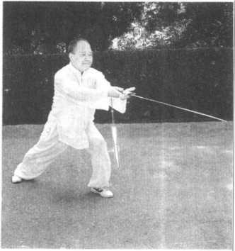 动作3:坐右腿迈左腿,脚跟先落地。左腿逐渐弓出成左弓 步,两臂由后向前朝下以仰手平剑双手将剑刺出(图27)。