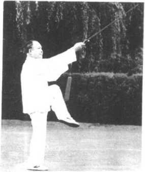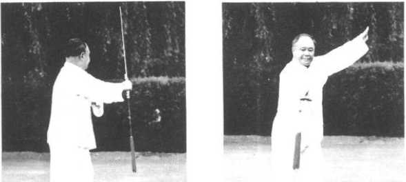 此式应注意两个转身要与整体协调。所谓两个转身:第一个是 指左脚落地的同时身向左转,两臂交叉,这是合的过程;第二个转 身是指左腿已坐实,在转身向右的同时,剑随身转,两臂分上下展 开,这是开的过程,也是发的过程。如果这两个转身能够和四肢协 调一致,此式自有其独特之处,外部形态较美。