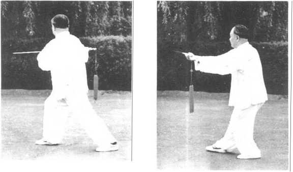 动作1:身向右转,剑随身亦向外展(图7丨)。动作2:身由右向左转动,重心向左腿移动坐实,顺势使右脚 成虚步置正前方。两臂随同腰腿由右向左转动时,翻腕扣剑,由俯 手平剑变为仰手平剑,带至左侧成阳剑.手心朝上,左手剑指仍在 右手腕内侧。面向正西(图72)。图71 图72用法:带腕和拨挂其器械。要点:持剑之手由阴剑(手心朝下)变阳剑(手心向上)时,其翻腕转 臂之动作宜先向右转体.使剑身向右后环有一定之角度此时翻 腕转臂就比较自然了,不然翻腕转臂就比较困难,外形也不好看。另外注意带剑宜平。右脚踩平。
