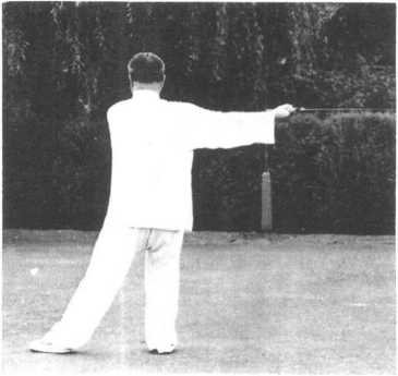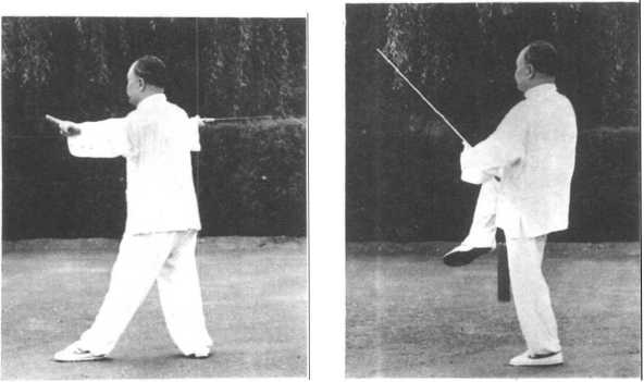 动作1:身向右转,两臂随同转体,右臂持剑向右后展,左手 置胸前图76)。