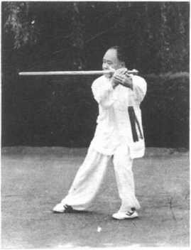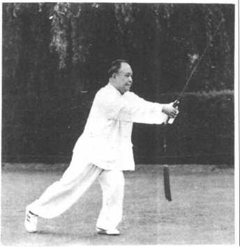 此式似有手抓马笼头 勒马之状。在转身持剑平 拉过程中,持剑宜平,身 勿呈起伏,垫步倒腿要轻 灵自如。