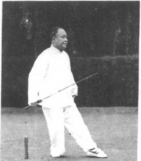 动作3:右脚离地,略 垫步,重心移至右腿坐实。 左脚成虚步,脚掌着地。两 臂随同腰腿后坐时分别收 至两胯旁。面向正东,两 眼正前平视(图86)。