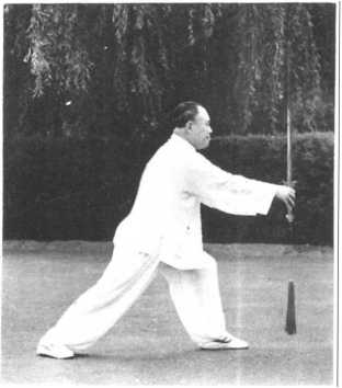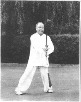 动作1:重心右移,身向右 转,左脚里扣,然后重心倒至 左腿。两臂仍在身前立剑(图 97)0