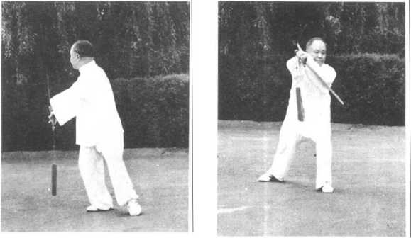 该式是以剑尖栽头倒置的手法,用反手立剑上刃向对方推出, 因之在向外往前推出时,要体现出推的意思。转身撩剑,要注意 随同腰腿之虚实变转,以及翻腕倒剑的整体协调,剑环下弧至撩 剑起,速度要匀,圈要圆,撩剑要灵活适度。