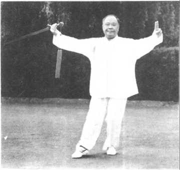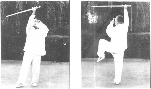 2.此式之定式与第4式之魁星式相似,唯左手中、食两指,置 剑臂之间。在用法上,此式是先劈,后提,而魁星式是先撩,后 平刺。