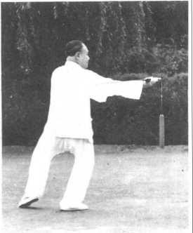 按该式名称内容,要体现出捞的意思,因之当左脚撇出以后, 即以腰带动两臂由右后向左前转,尤其持剑之右臂要以14弧度