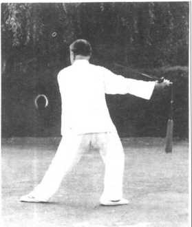 随腰环剑。当右脚着地,左腿后撤前腿又随即收回之际,其剑随 臂也由前向后,成收图形状。步法要轻灵,尤其撤步收脚的动作, 当右脚刚着地.随即撤步,更显得轻松自如。注意抱剑在腹部左 侧.似第20式之怀中抱月。