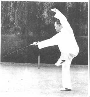 动作:右腿斜上步,重心右移,右腿站立。左腿顺势屈膝提 起,脚尖自然下垂,脚面略有绷意。右臂随同往前朝下以正手平 剑将剑刺出。左臂翻腕转臂,由下向外往上屈至头部上方。面向 正西,两眼朝下看剑尖前方(图120)。用法:探身向其膝、脚刺之。要点:此式为上步单腿 独立下刺,与第21式 之宿鸟投林正好是一 上一下也应注意整 体协调。探身下刺上 身勿挺直,应略向下 弯曲。左臂要成圆弧 形曲至头部上方。