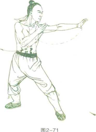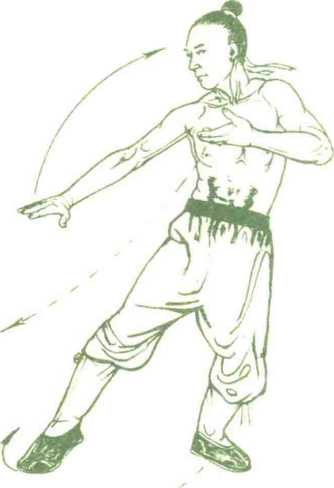 右脚跟蹬地,借身体的前冲将左 掌送出Q要短促,有弹力
