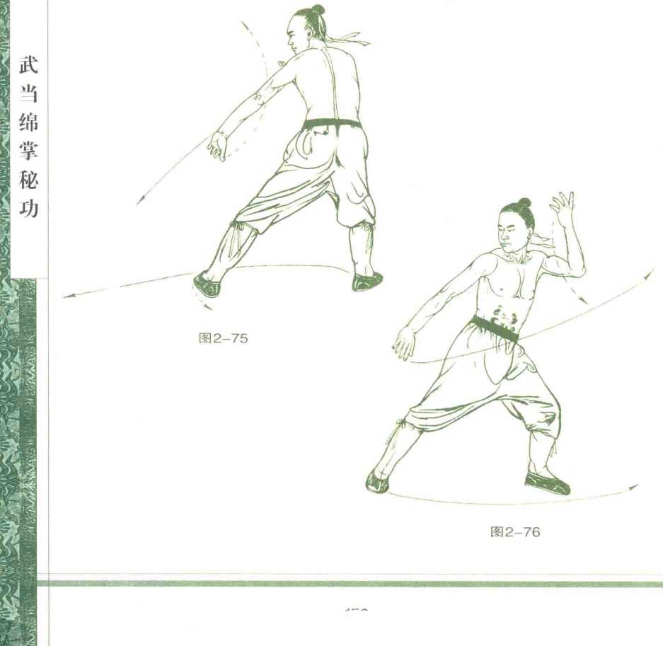 2 .借助腰的扭摆,双腿重心变为 右七左三的偏马步;同时,左右掌经 胸前向左侧甩出D左臂略成弧形,左 掌变俯掌,高与胯平,左臂略伸直;右 掌变仰掌,置于左肩前侧,掌心向L 目视左掌“(图2-75)