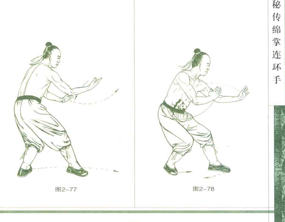 1 .左转体90。,右脚向左前方上 进一步,左脚跟步,成小蹲势;同时、 右掌向拇指侧翻转成仰掌,由右侧腰 间向前托出,肘部略屈,高与肩平;左 掌垂直下落,成俯掌,护于右肘内和, 目视右掌。(图2-77)