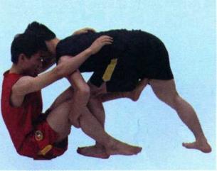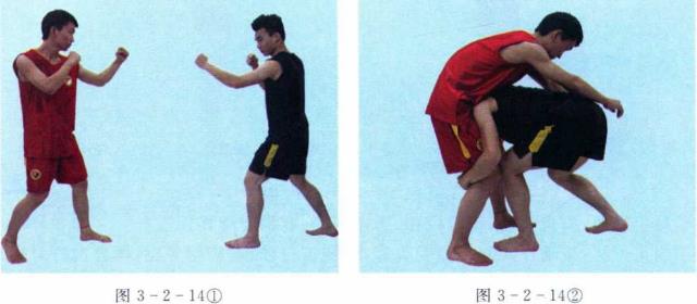 (1)抱腿前顶由实战姿势开始上左步身体下潜闪躲然后两手抱对方双腿膝窝下部两手用力回拉。同时用左肩前顶对方大腿根部或腹部将对方摔倒。(图3-2-14123)