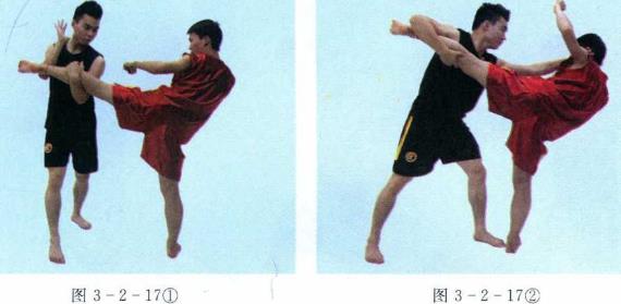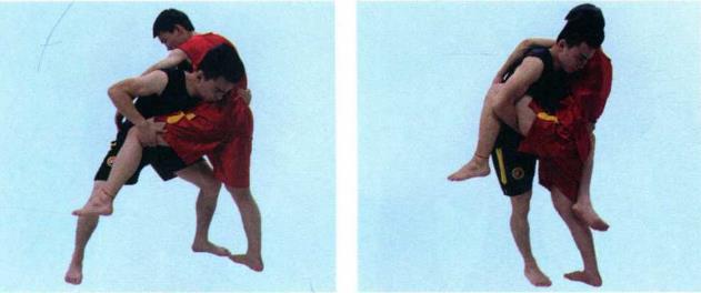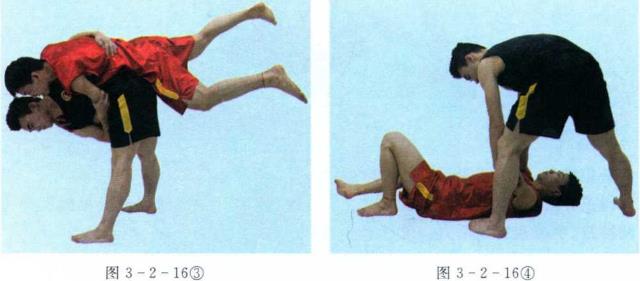 使对方的左腿离地。左腿抬起前伸由前向后搂挂对方的支撑腿,同时用左肩向前顶靠对方肋部将其摔倒。(图3-2-15123)
