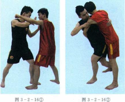 (1)抱腰过背对方用左贯拳攻击头部时立即向左闪身左脚向前上半步同时左臂由对方右腋下穿过搂抱对方后腰右手由内向外格挡并夹握对方左臂。然后身体右转右脚向后插半步双腿屈膝臀部抵住对方小腹。继而两腿蹬伸弓腰头向右转将对方背起后摔倒。(图3-2-161234)